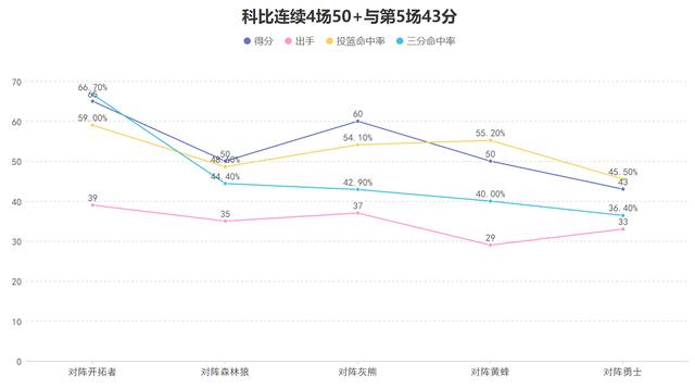 这个赛季的科比还缔造了一项传奇的纪录,从对阵开拓者的单场65分开始到对阵黄蜂的50分结束,科比连续4场比赛拿下了50分以上,第5场对阵勇士时科比中断了连续50+的纪录拿到了43分,湖人也取得了五连胜,当时的媒体用“科比仅拿43分”作为新闻的标题,当43分都要用“仅拿”来形容时,可想而知科比的得分到底达到了什么级别。