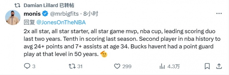 雄鹿记者@Monis在这条内容的评论区写道:“2届全明星、全明星首发、全明星赛最有价值球员、NBA杯冠军、过去两个赛季联盟得分最高的组合成员。上赛季得分排名联盟第十。NBA历史上第二位在34岁时场均能贡献24+分、7+助攻的球员。雄鹿队过去50年里从未有过达到如此水准的控球后卫。”