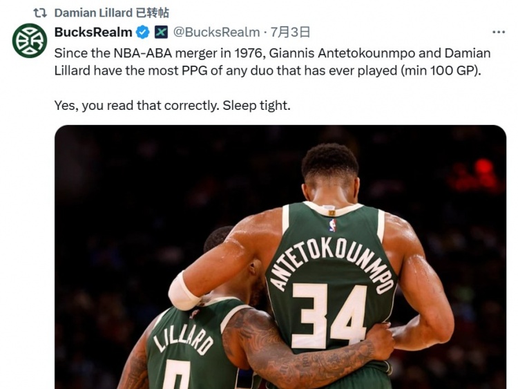 雄鹿自媒体BucksRealm发推:自1976年NBA与ABA合并以来,扬尼斯-阿德托昆博和达米安-利拉德是所有曾搭档过的双人组中(至少共同出战100场比赛)场均得分最高的。没错,你没看错。安心睡吧。”