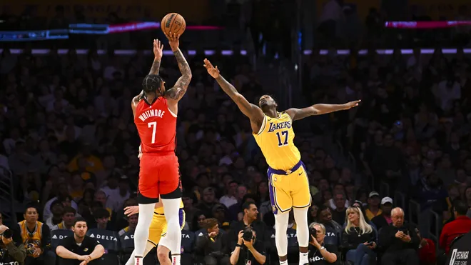 不过,芬尼-史密斯却是一位擅长投射底角三分球的球员,他的两个底角三分命中率分别是42.9%和43.5%。2024-25赛季,芬尼-史密斯代表湖人出战43场常规赛,场均7.9分3.6篮板1.4助攻0.9抢断,三分命中率39.8%。季后赛芬尼-史密斯出战5场,场均得到6.2分4.2篮板2.6助攻0.2抢断,投篮命中率41.4%,三分命中率36.8%。