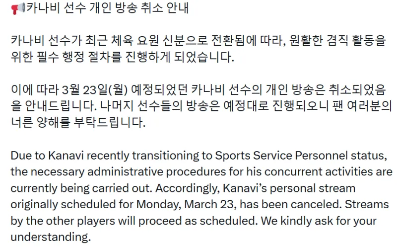 ​特此通知,原定于3月23日进行的Kanavi选手个人直播已取消。其他选手的直播将按原计划正常进行,恳请各位粉丝予以谅解。